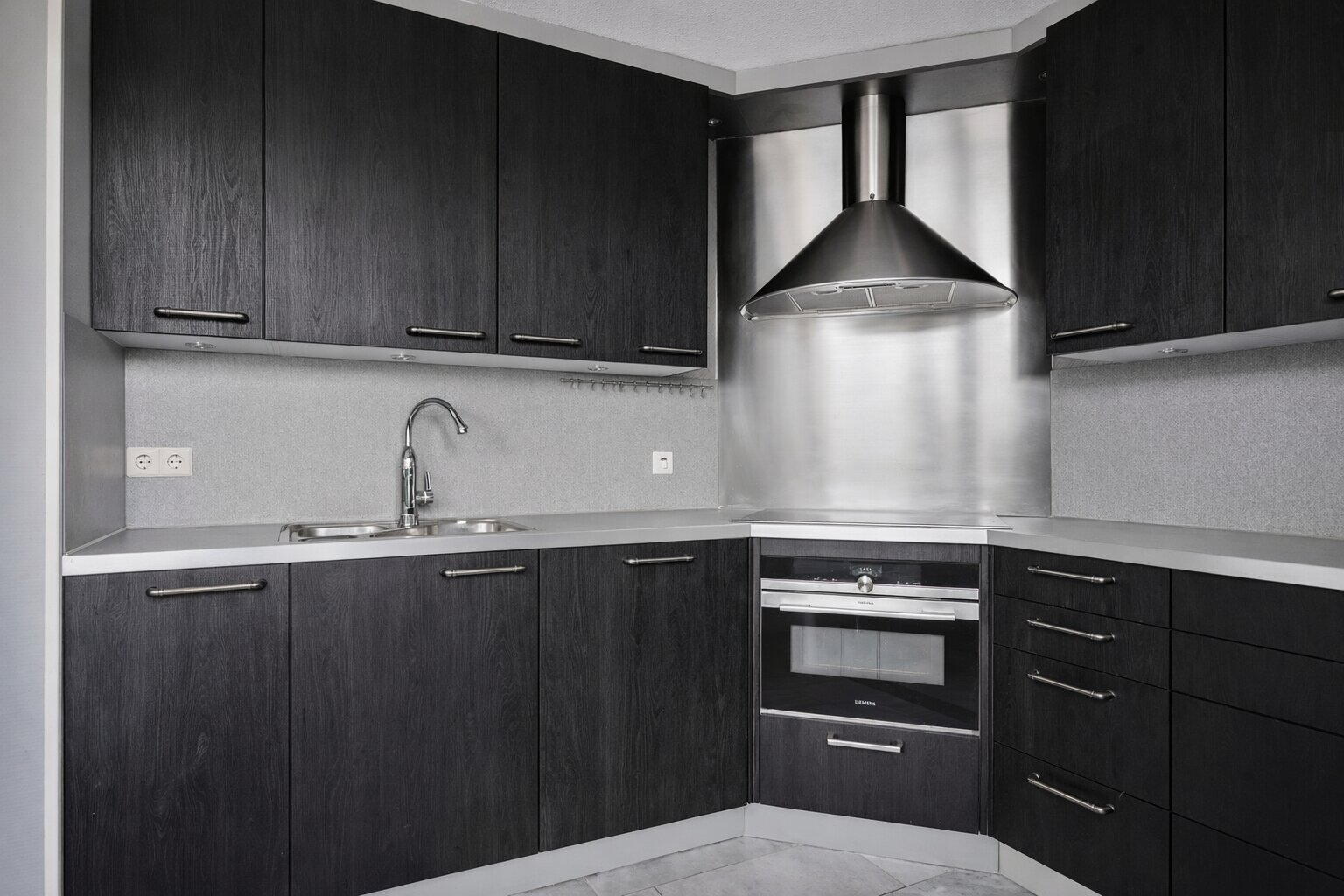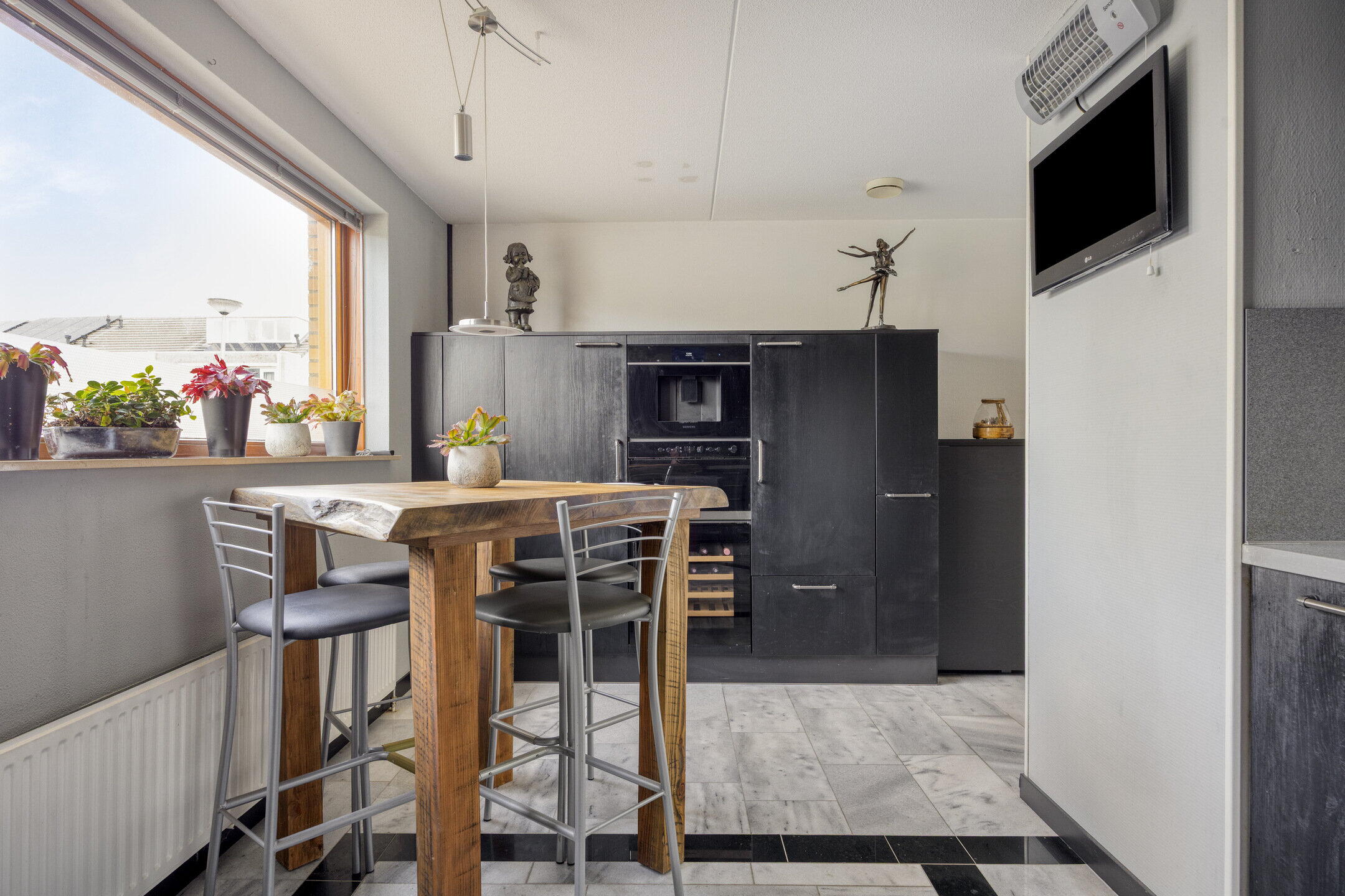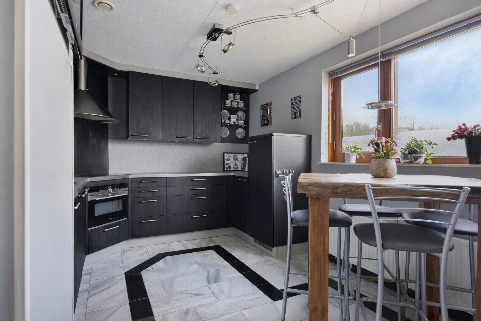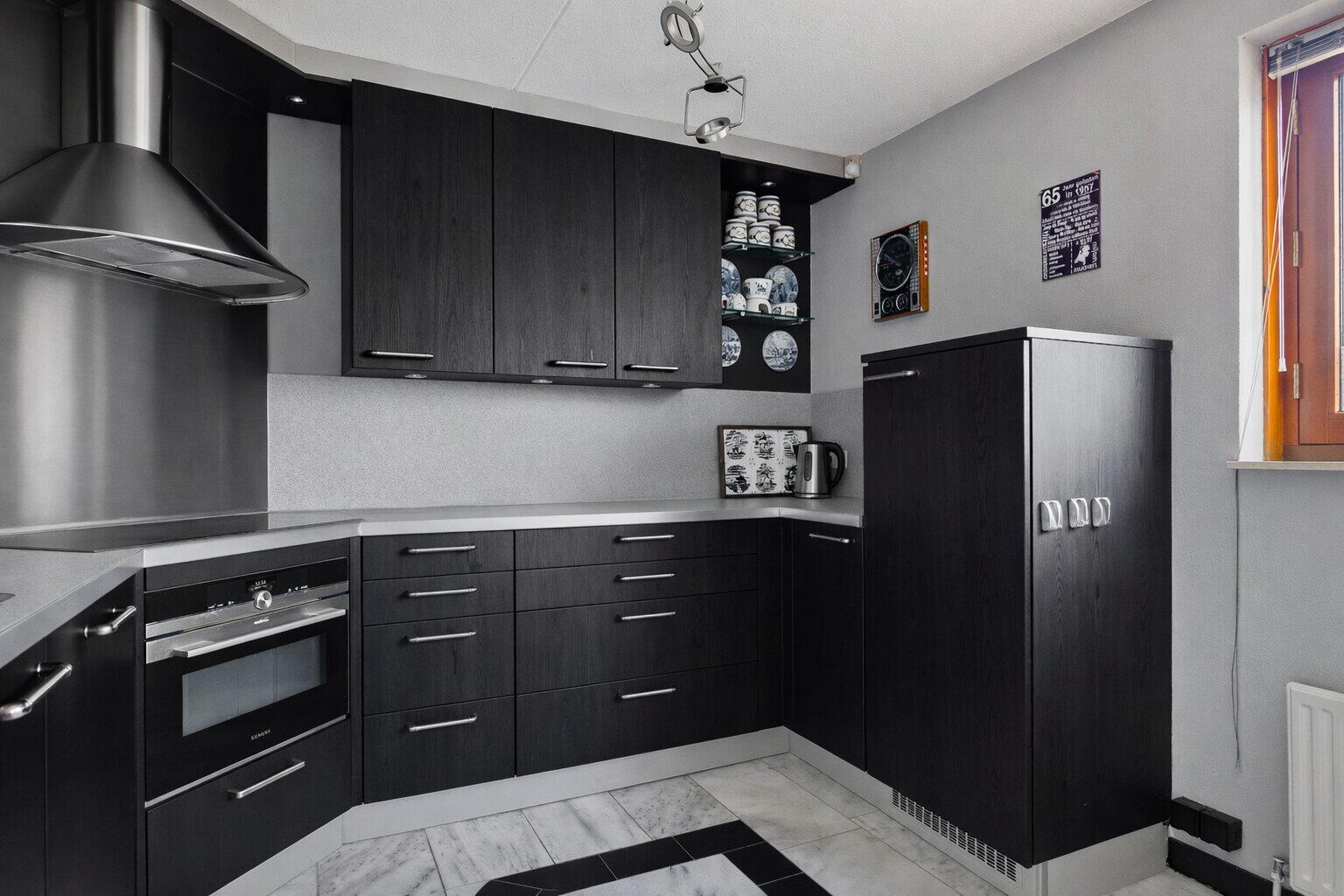 Aan de voorzijde van de woning bevindt zich de open keuken. Deze is van alle gemakken voorzien en biedt ruimte voor een extra eethoek, waardoor je hier een volwaardige leefkeuken creëert.