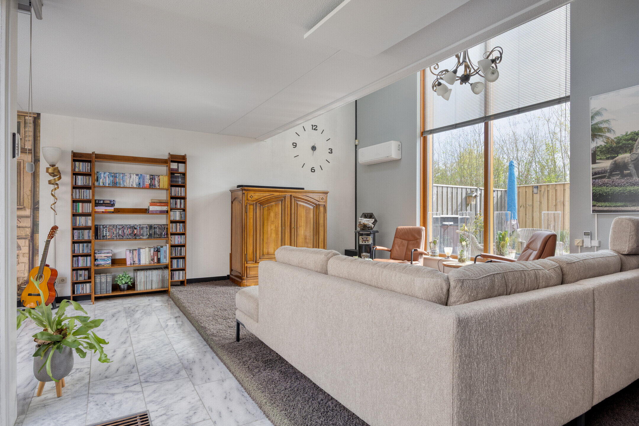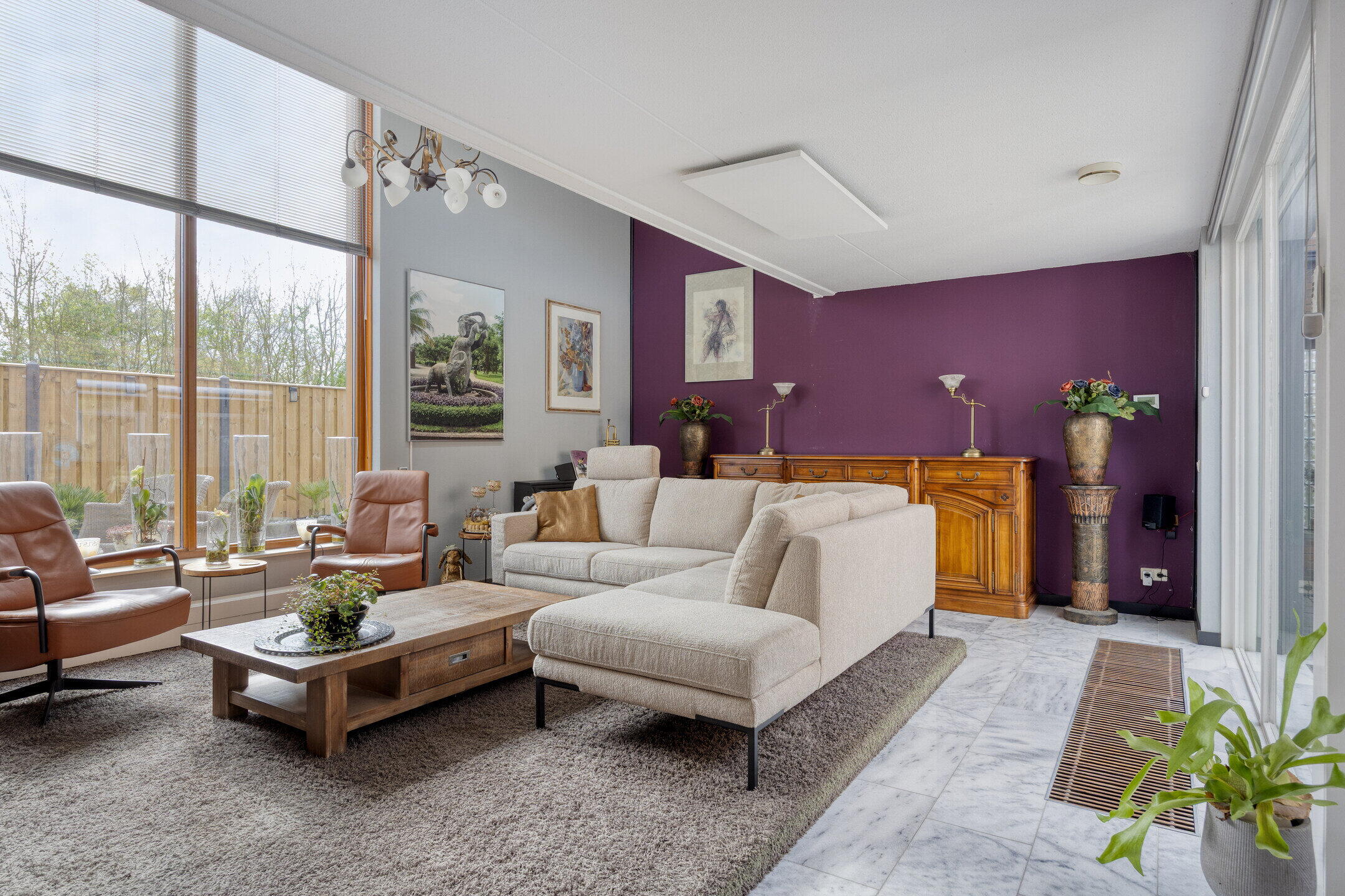 De woonkamer is zonder twijfel het hart van de woning. De enorme raampartij en de indrukwekkende vide zorgen voor een ongekend ruimtelijk gevoel en een zee aan licht. De zithoek is speels verhoogd op een podium, wat zorgt voor een uniek en gezellig karakter.