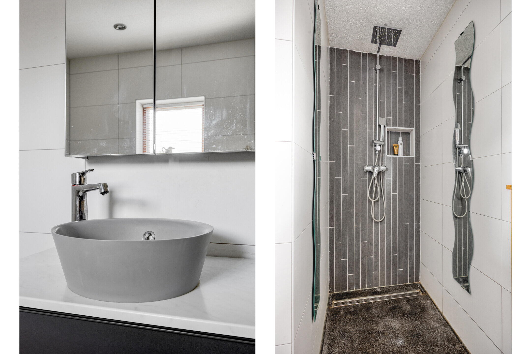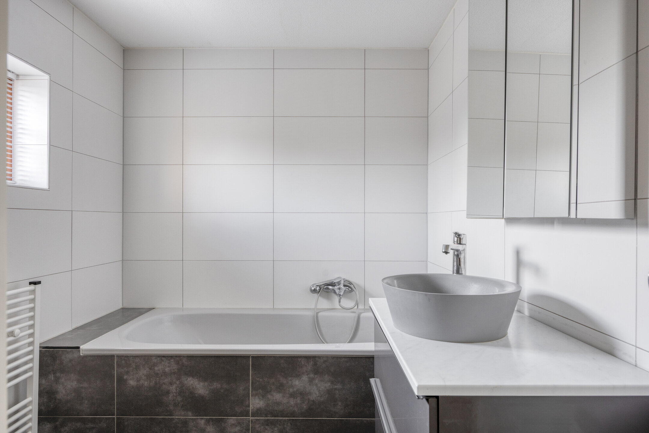 De badkamer is uitgevoerd in een tijdloze grijs-witte kleurstelling en voorzien van een ligbad, aparte douche en een wastafel met meubel. Ook is er een separaat toilet op deze verdieping aanwezig, wel zo comfortabel!